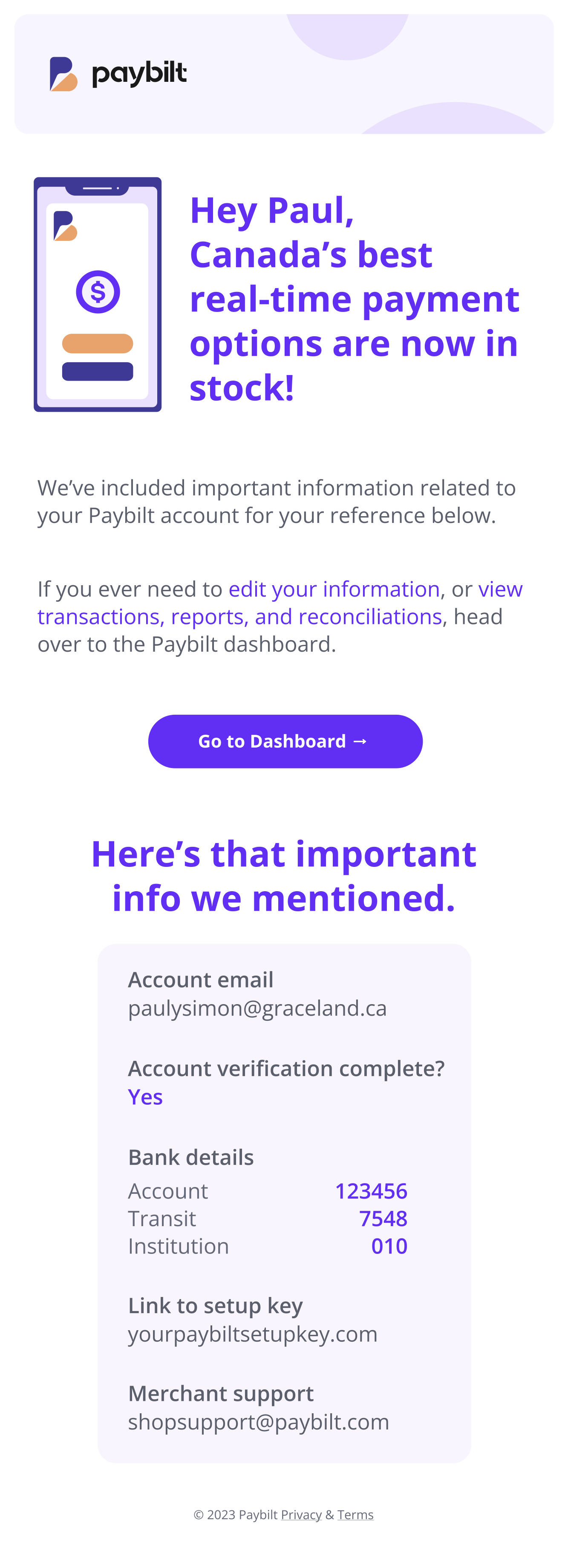 Communications in tandem with the user flow keep the merchant in the loop of where they are in the signup process. They’re designed to adhere to a strong branding theme, while conveying clarity and security.