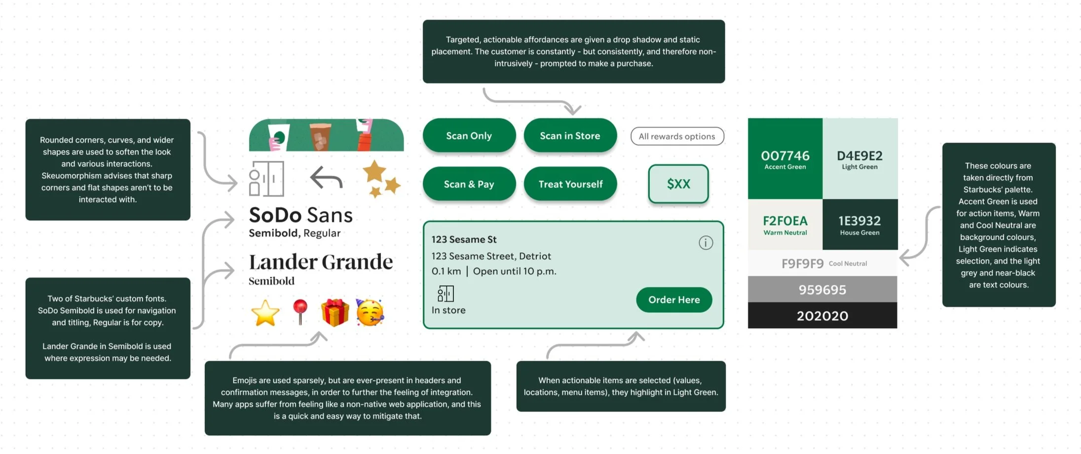 I designed UI elements for the app using Starbucks’ available branding guidelines, and existing graphic assets from the current version of the app using the findings from my research to improve them.